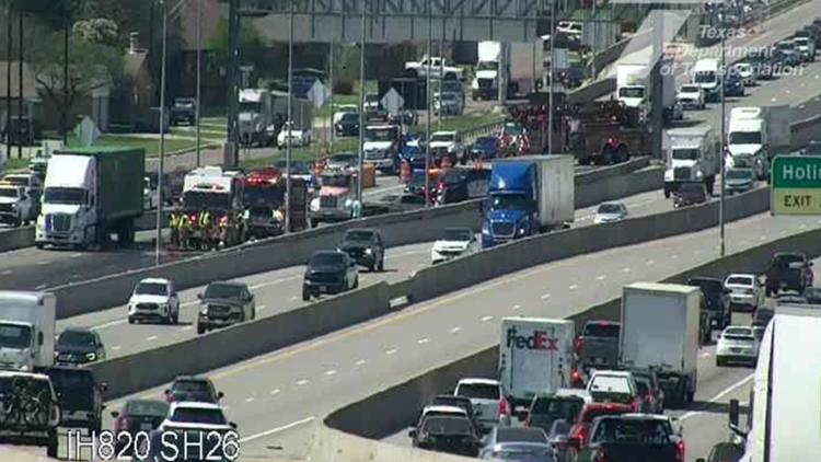 A fuel spill from a crash has closed eastbound lanes of I-820 near Holiday Lane; police say cleanup efforts is expected to last through rush hour.