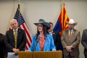 Read More Senate Majority Leader Janae Shamp, R-Surprise, speaks at a press conference on June 17, 2025, during which she and a MAGA group claimed